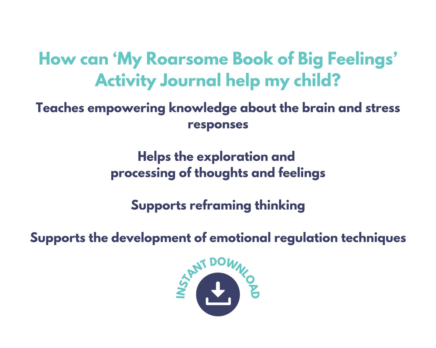 My ROARSOME Book of Big Feelings is a printable emotional regulation workbook created to help children aged 6 and over learn about feelings and develop healthy coping strategies. With a playful dinosaur theme and engaging illustrations, this workbook makes learning about emotions both fun and meaningful.