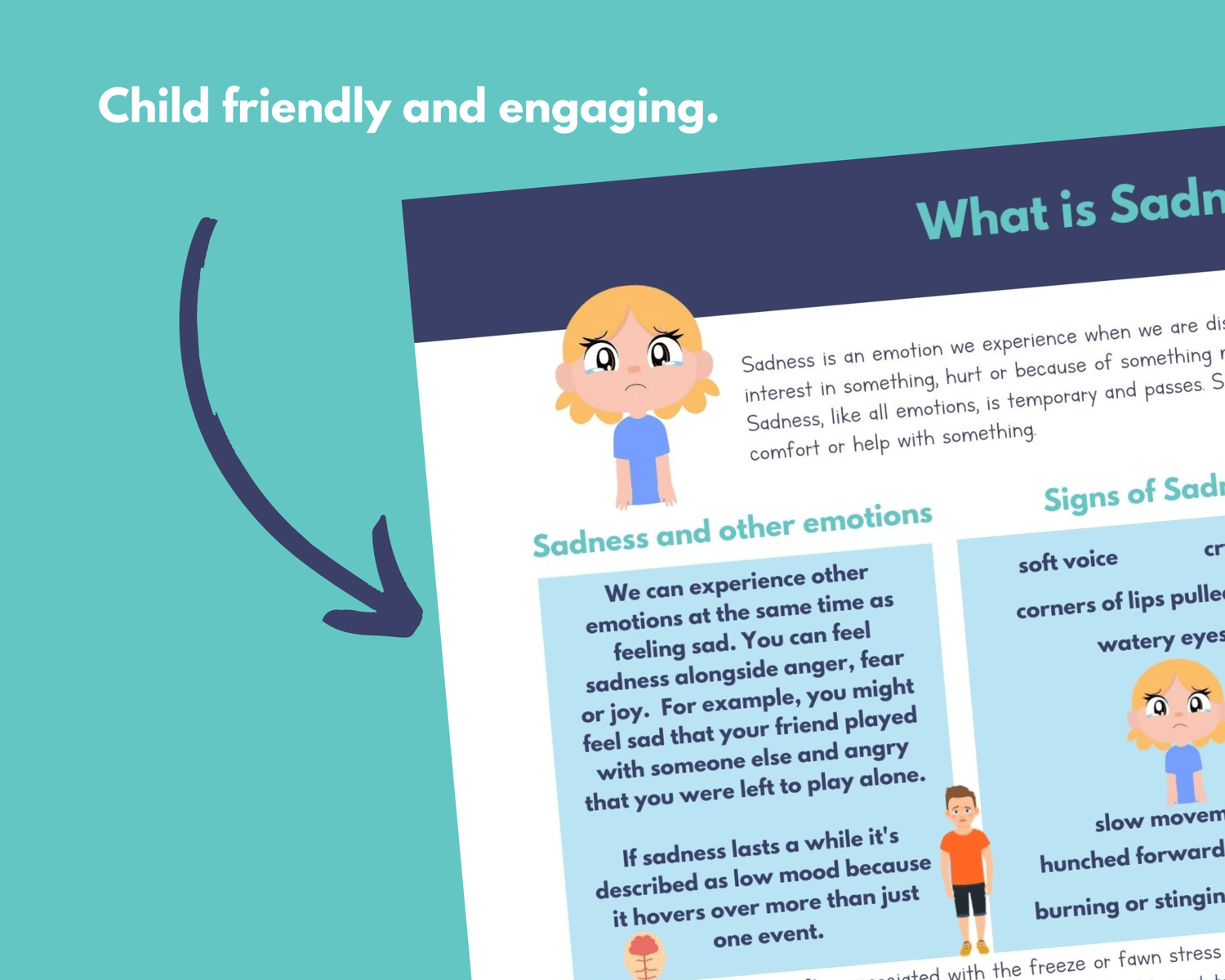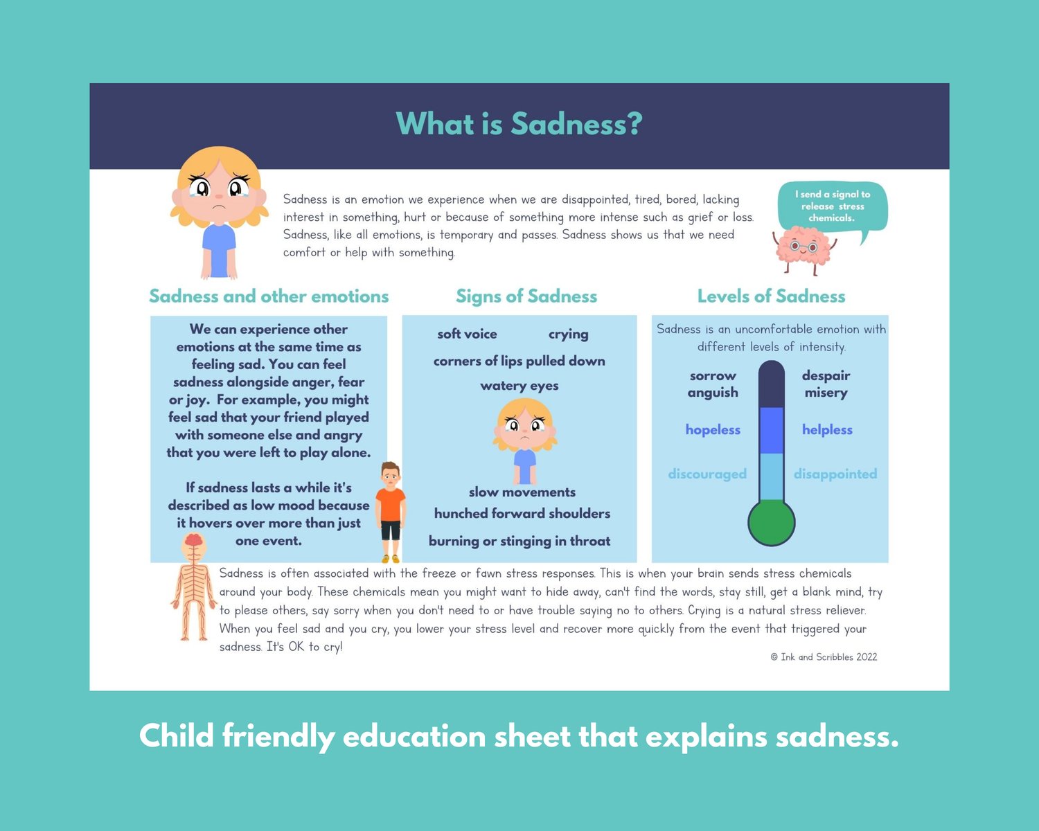 An educational infographic sheet to help children understand and learn empowering knowledge about sadness.