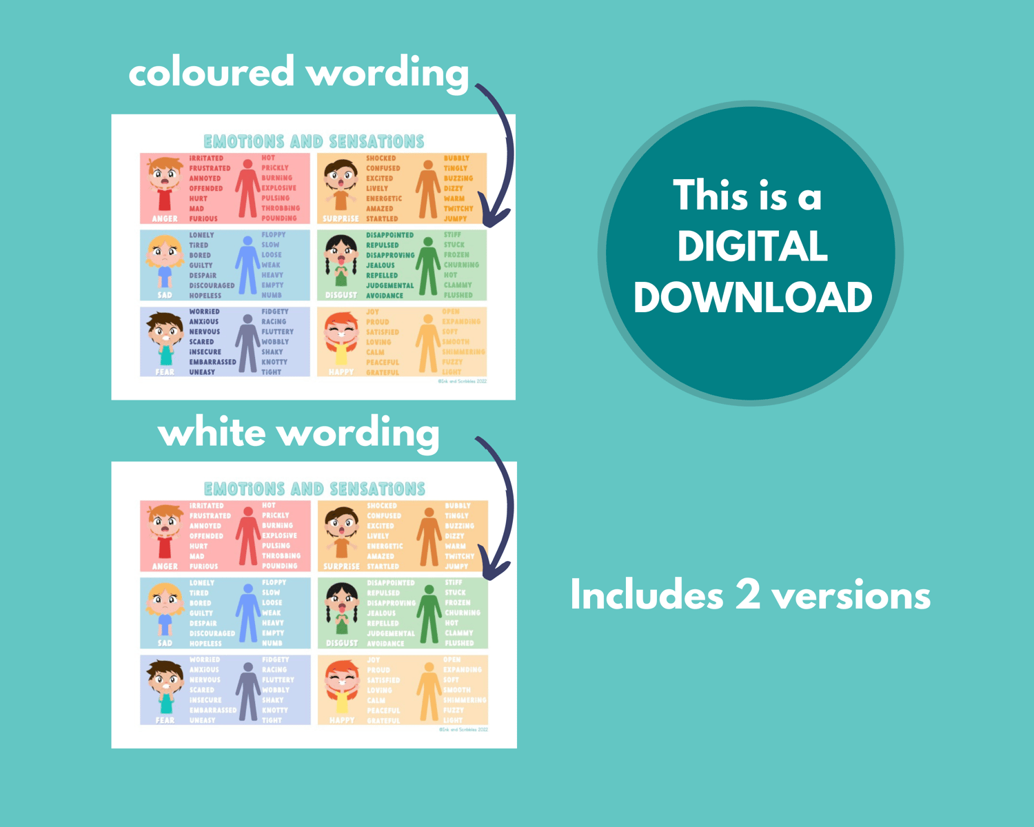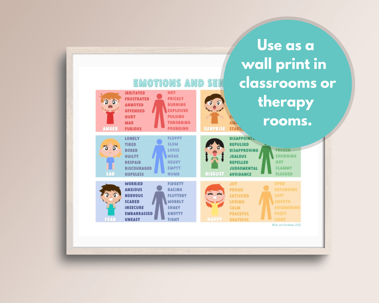 A printable emotions list that demonstrates associated physical experiences to support children's emotional intelligence and wellbeing.