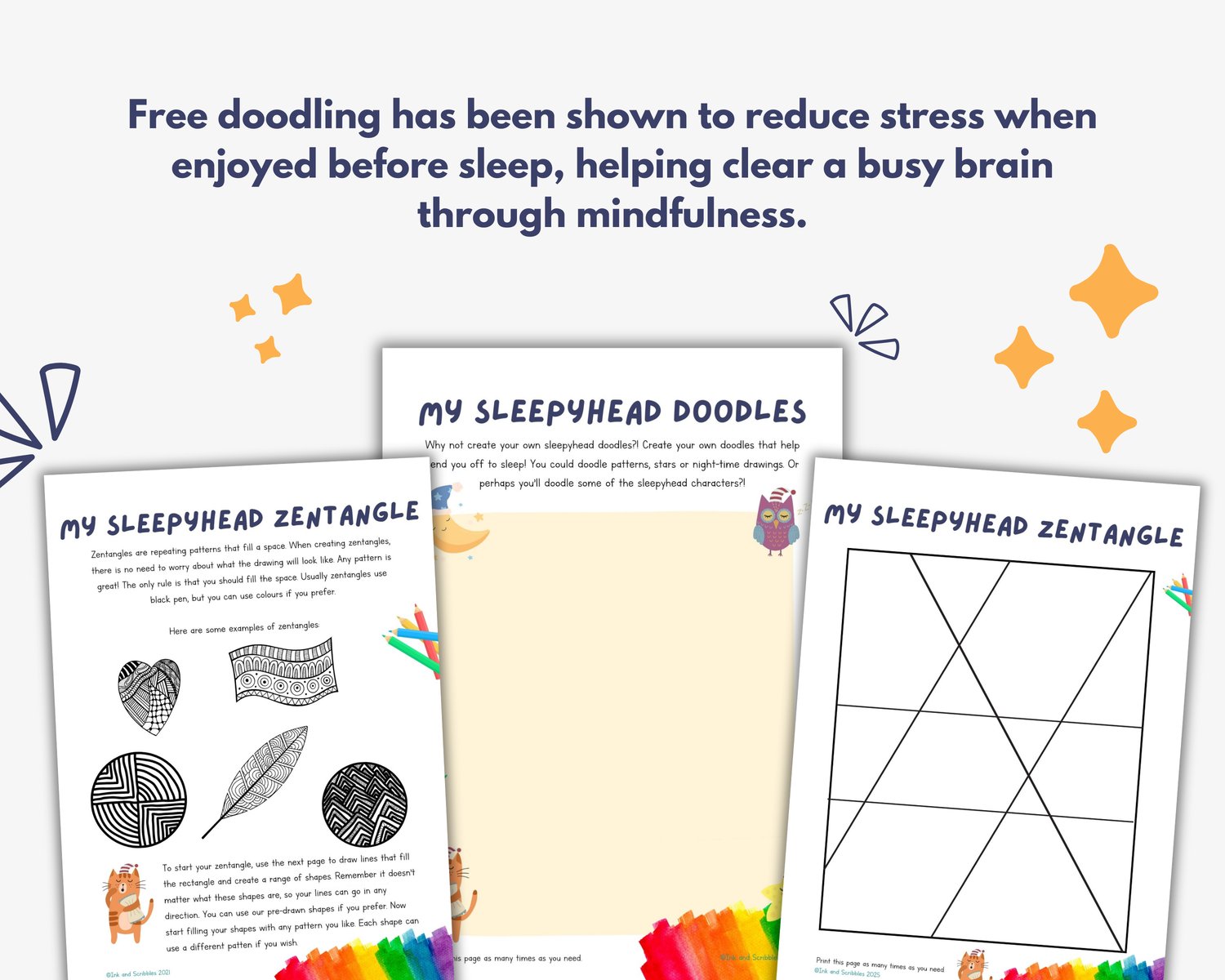 6 cute mindfulness colouring pages for relaxation, plus a Sleepyhead doodle page, which can be printed unlimited times (American Spelling Version Included) and Zentangle Art Therapy Sheets.