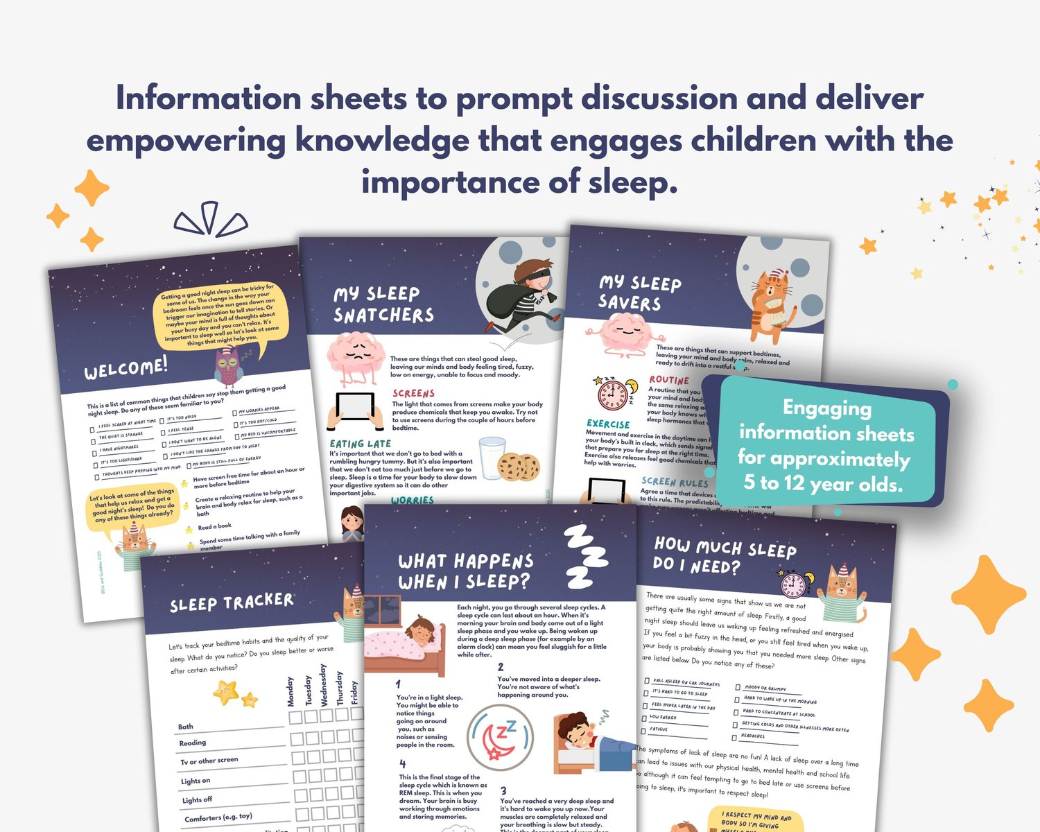 - Children's information sheets including 'What happens when I sleep?' information sheet, 'Sleep Snatchers' Information sheet, 'Sleep Savers' Information Sheet, 'How much sleep do I need'?' information sheet