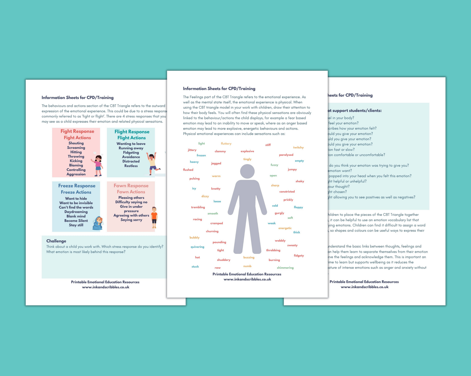 This 6 page PDF contains information on the CBT Triangle model to help you with your work in the area of child wellbeing. This pack is for information and knowledge provision that supports staff in settings such as schools, to help them understand a child's emotional experience more deeply or support a child to develop self awareness of their emotional experience.