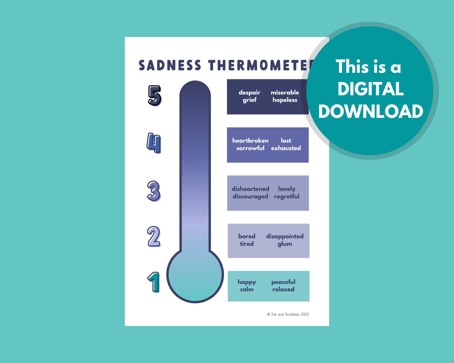 sadness thermometer, sadness scale, printable, PDF, teenagers, low mood, grief, depression, understanding sadness